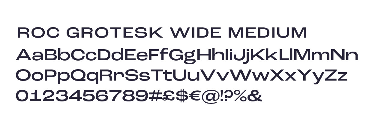 Roc Grotesk Wide is part of the Roc Grotesk family but we use this specifically for sub-headings capitalised and with letter spacing.
